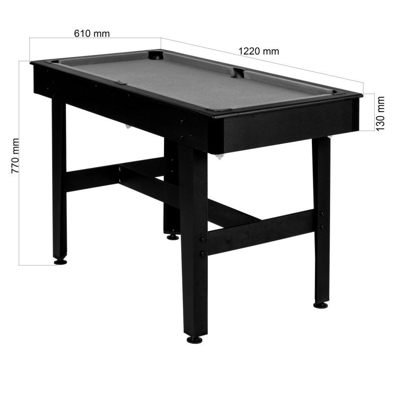 Kulečníkový stůl přináší biliard z hracích hal do vašich domovů. Užijte si velkou zábavu v malé ploše. Díky příslušenství, které je součástí dodávky máte vše, co potřebujete k tomu, aby jste mohli ihned začít hrát. Kromě ochranné funkce pro rohy, snižuje zaoblená ochrana hran nebezpečí poranění. Díky výškově nastavitelným nožkám se závitem lze stůl snadno vyrovnat a vyvážit.