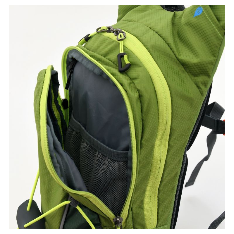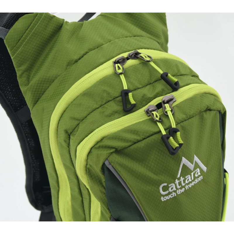Zelený batoh Cattara GreenW o objemu 10 l s integrovaným pitným vakem o objemu 2 l má měkké výstuže a větrané zádové části, která zajišťuje cirkulaci vzduchu.