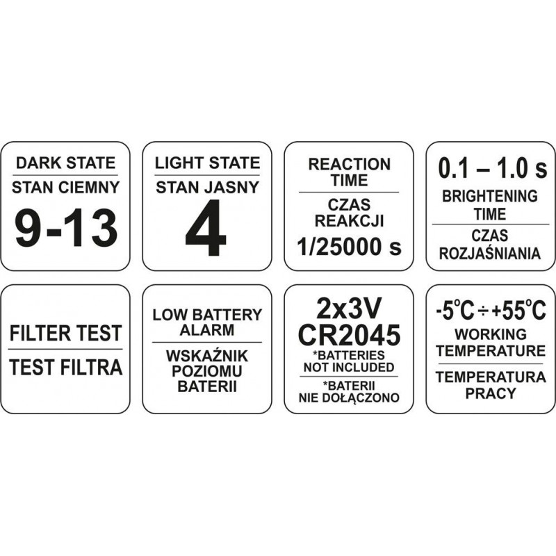 Perfektně navržená helma s dokonalým designem, která vás zajisté nadchne! Chrání celou hlavu a hlavně obličej při svařování, především vaše oči náchylné na škodlivé záření. Proto je helma vybavena samostmívacím filtrem s velmi rychlou reakční dobou, který poskytuje ochranu proti ultrafialovému a infračervenému záření. Nastavení citlivosti je velmi hladké a plynulé, výhodou je nastavení rychlosti ztmavování. Přilba je napájena ze dvou 3V baterií nebo solárním článkem. Disponuje skvělým nastavením čelenky, která padne na jakýkoliv typ hlavy a je zaručen maximální komfort při nošení