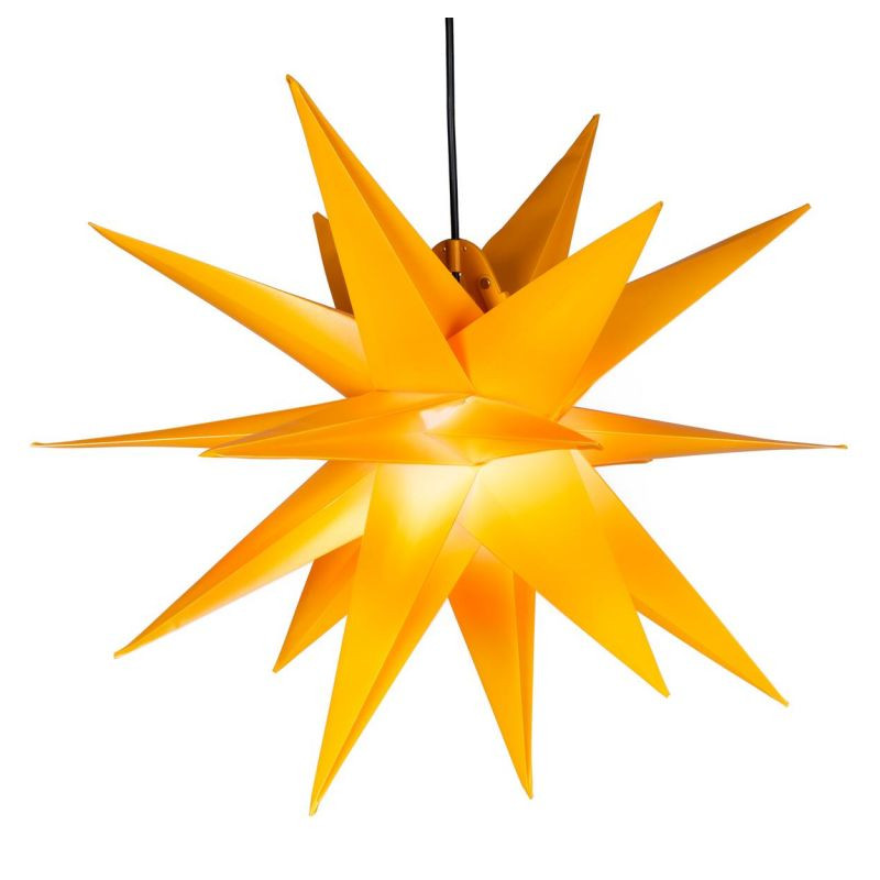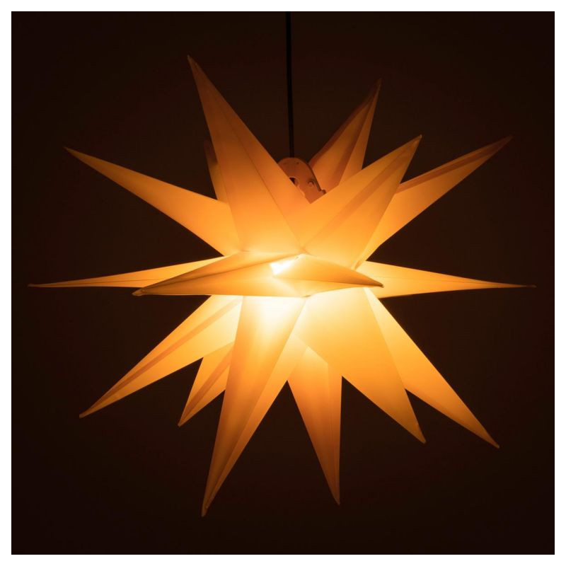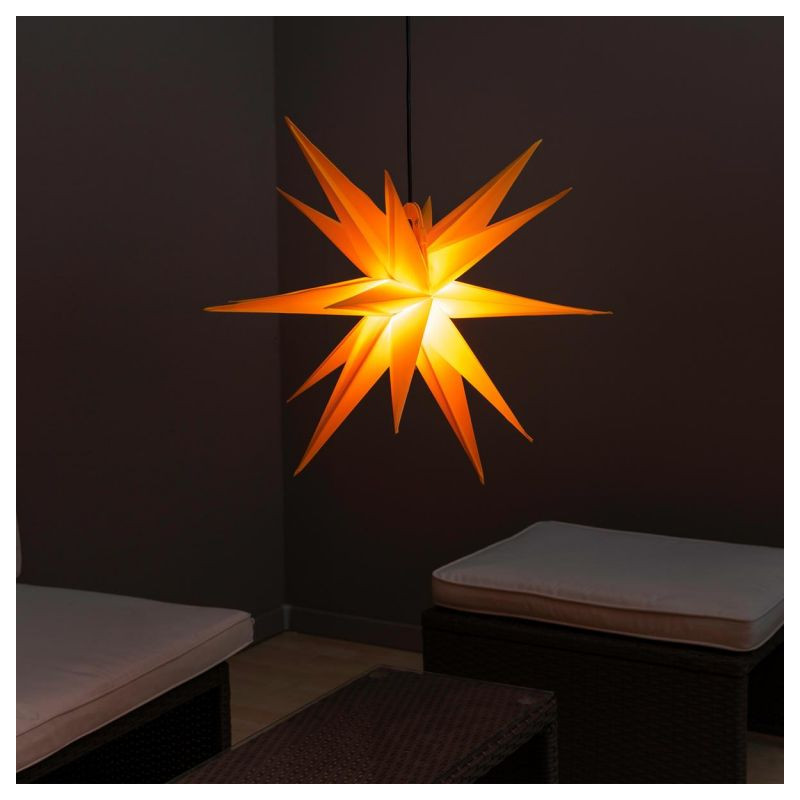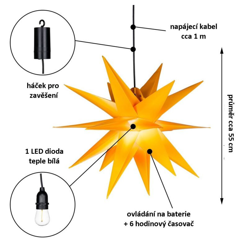 Vánoční hvězda z vysoce kvalitního PVC rozsvítí nejen Vaše okna, ale také celý domov. Lze ji volně zavěsit do prostoru. Díky napájení na baterie nebudete závislí na přístupu k zásuvce. Zkrášlete si svou domácnost touto tradiční dekorací v moderním provedení a ve žluté barvě.