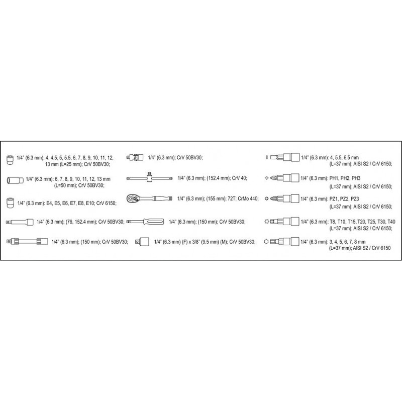 Gola sada 1/4" obsahuje 56ks: nástavců, prodlužovacích nástavců, ráčnu s plastovou rukojetí a další příslušenství. Vyrobené z kvalitní oceli CrV50BV30, CrV40, CrV6150, CrMo440 a S2 s funkcí AS-DRIVE. Ráčna má jemný 72 zubý chod. Funkce AS-DRIVE umožňuje vyvinout větší kontaktní sílu, neboť ke kontaktu se šroubem nedochází na hranách šestihranu, nýbrž v první třetině styčných ploch. Tím nedochází k poničení hlavice šroubu. Ořech mnohdy povolí i matice a šrouby již poničené. Sada je přehledně uložena v kufříku.