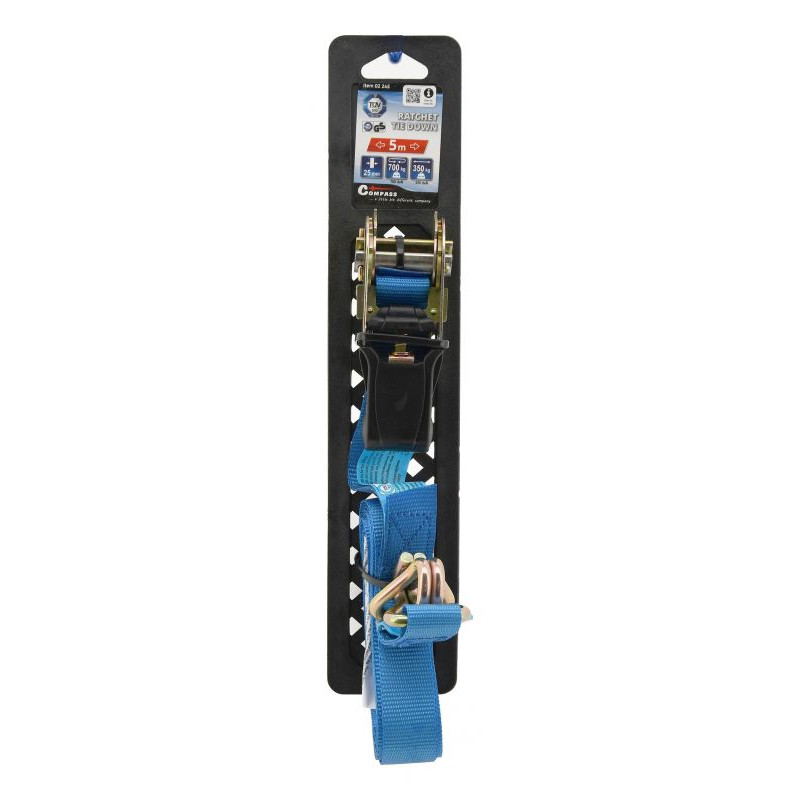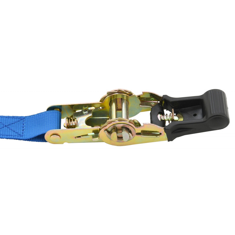 Ráčna je celokovového provedení s odolným jistícím mechanismem a poplastovanou rukojetí pro pohodlnou manipulaci a použití. Popruh šíře 25 mm s délkou 5 m se vyznačuje pevností v tahu 700 kg (po obepnutí nákladu). Při upínání nákladu doporučujeme používat plastové rohy nebo ochranné návleky. Bez použití ochranných návleků, nebo rohů, dochází ke snížení pevnosti upínacích pásů a k opotřebení popruhu.