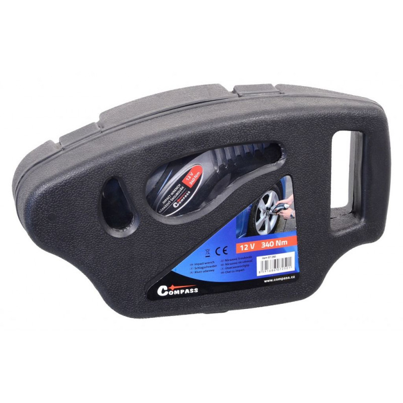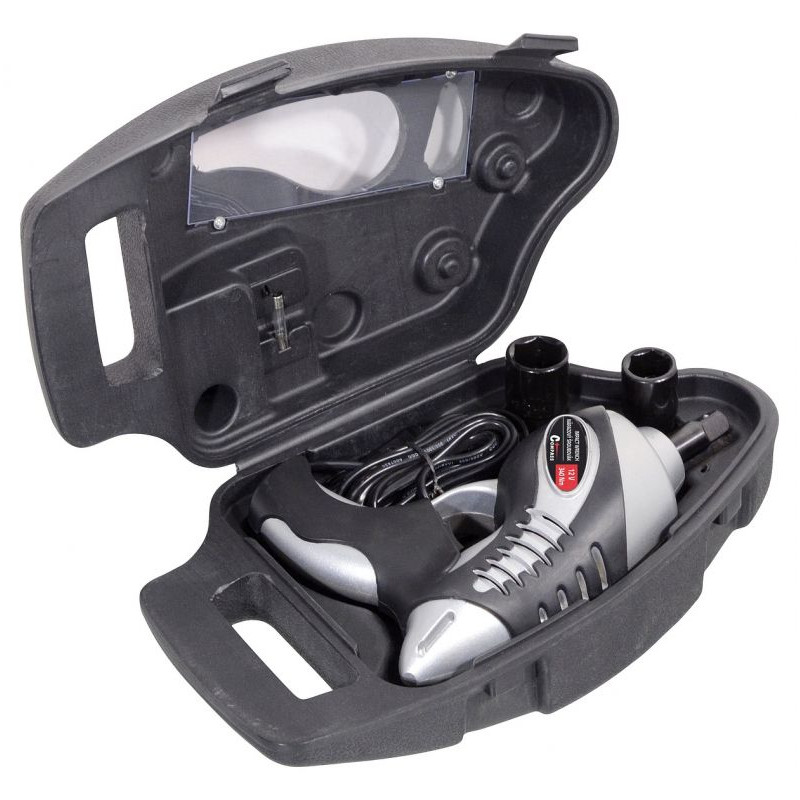 Nárazový šroubovák se zástrčkou do zásuvky automobilového zapalovače 12 V je určen pro povolování a utahování matic či šroubů kol. Je dodáván v uzavíratelném plastovém kufříku a obsahuje vyměnitelné nástavce z chrom-vanadiové oceli. Dlouhý kabel umožňuje pohodlně utáhnout všechny kola vozidla.