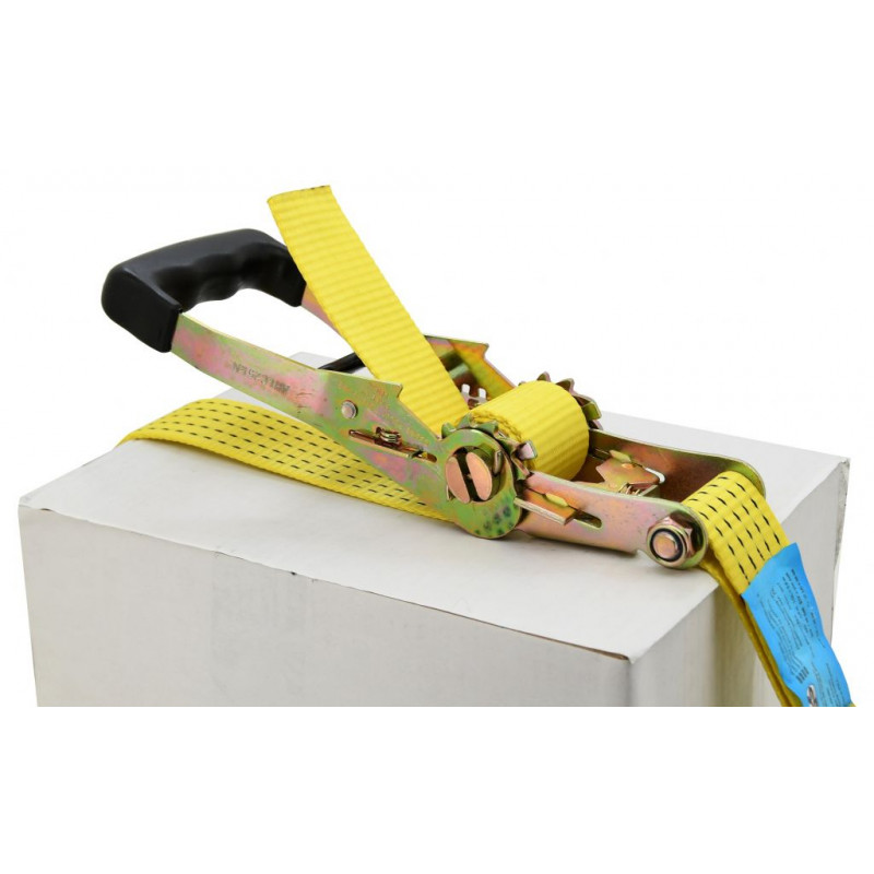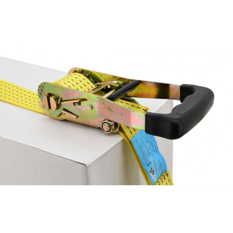 Upínací ráčnový popruh s kovovými háky, s homologací TÜV/GS, pro zajištění těžkého nákladu. Ráčna je celokovového provedení s odolným jistícím mechanismem, opatřeným plastovým madlem pro pohodlnou manipulaci a ovládání. Popruh šíře 50 mm s délkou 8 m se vyznačuje pevností v tahu 5000 kg (po obepnutí nákladu). Při upínání nákladu doporučujeme používat plastové rohy nebo ochranné návleky. Bez použití ochranných návleků, nebo rohů, dochází ke snížení pevnosti upínacích pásů a k opotřebení popruhu.