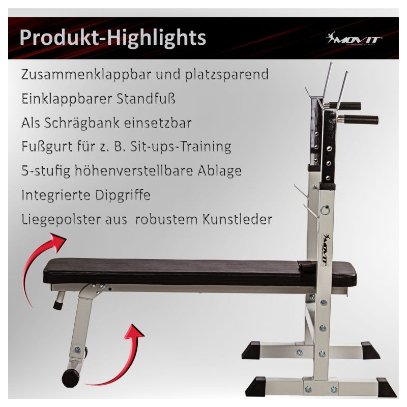 Díky sklopným nohám lze posilovací lavici použít také jako šikmou lavici, včetně popruhu na nohy k zajištění pro sedy-lehy.