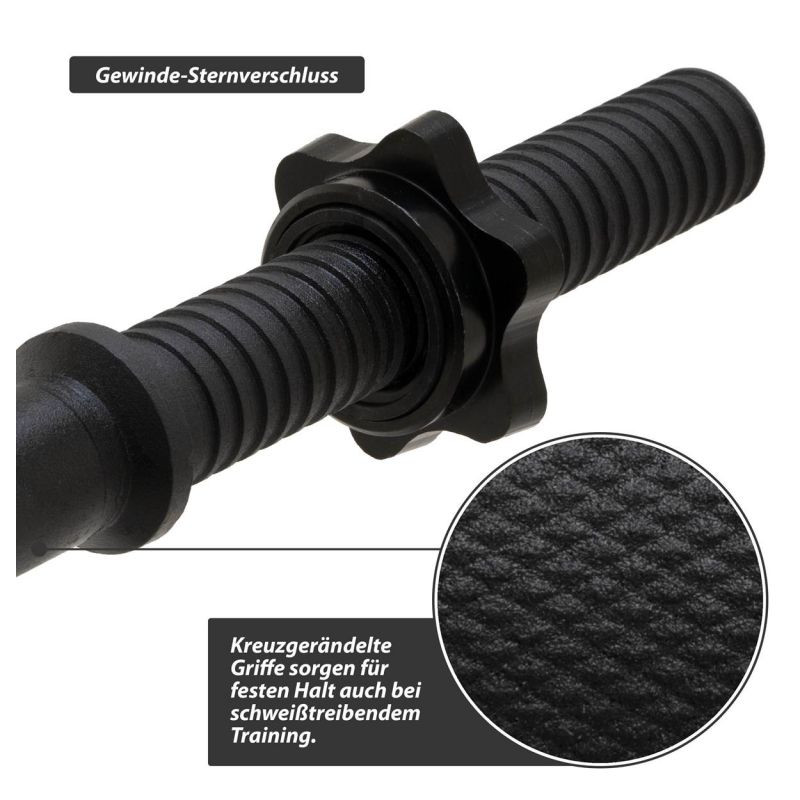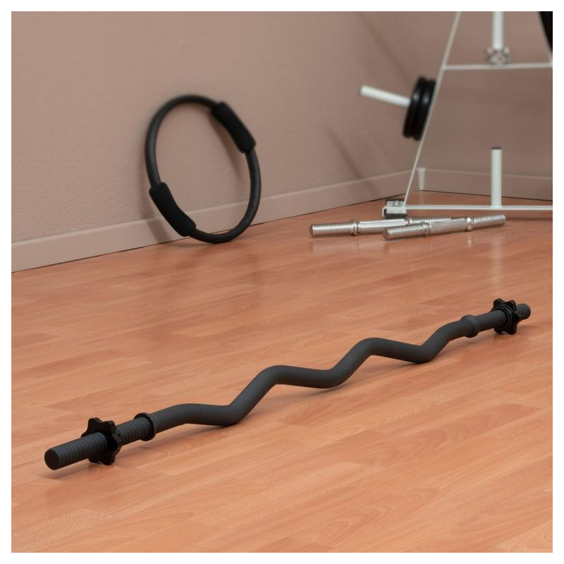 Zakřivený tvar tyče umožňuje různé možnosti úchopu pro procvičení různých částí svalů a umožňuje procvičit konkrétní svalové skupiny i komplexní procvičení celého těla. Ideální pro náročný trénink s menším zatížením zápěstí než s jednoruční činkou. Díky zakřivenému tvaru je činka vhodná zejména pro efektivní a účinný trénink paží. Hvězdicové upevňovací prvky lze poměrně rychle povolit a opět bezpečně upevnit, takže je zaručena pevná fixace závaží.