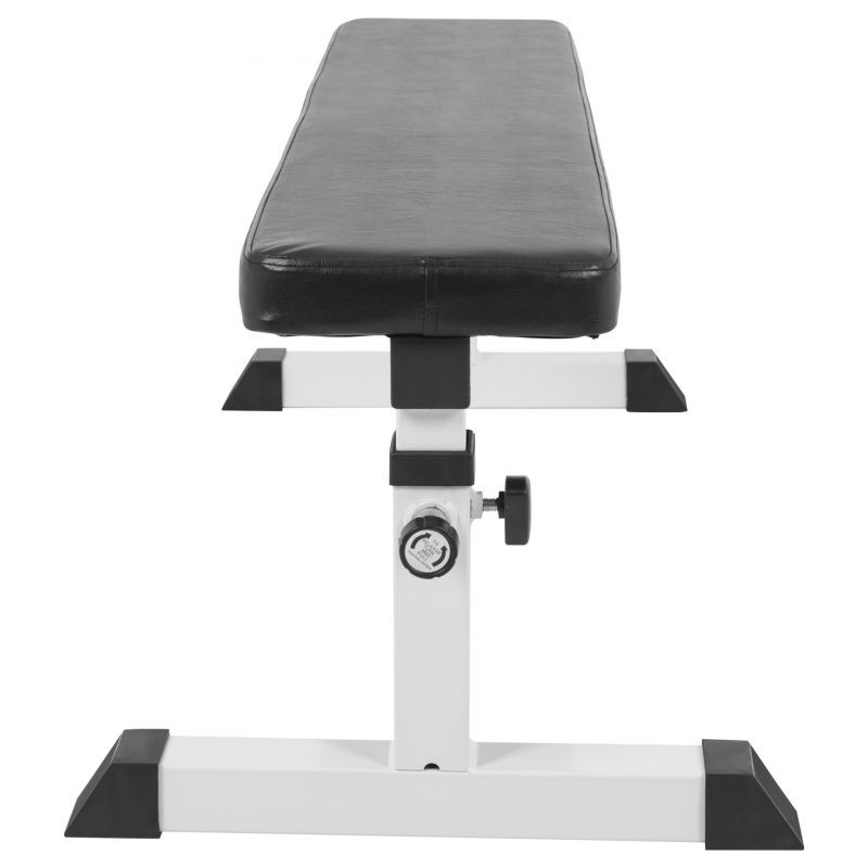 Díky čtyřem nastavitelným výškám je toto klasické tréninkové zařízení vhodné pro všechny velikosti postavy. Prostřednictvím různých cviků s činkami a závažími procvičíte hrudník, paže, zádové svaly, ramena i břicho. Nastavitelná plochá lavice s robustním rámem z bílé oceli vydrží opravdu mnoho, zatímco nohy s protiskluzovými gumovými krytkami poskytují stabilní oporu. Pomocí rychloupínacího šroubu si můžete nastavit výšku. Robustní a snadno udržovatelné sedadlo z černé imitace kůže poskytuje ideální tréninkový povrch.