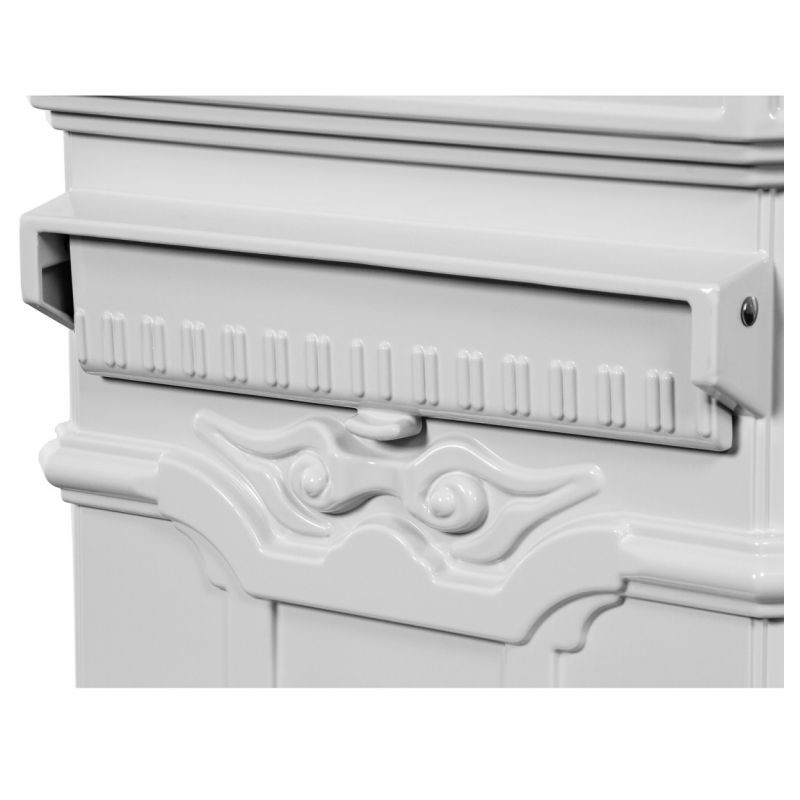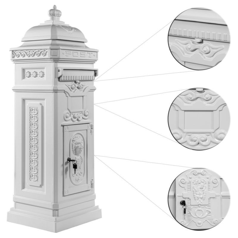 Krásná robustní poštovní schránka v antickém stylu v bílé barvě. Vysoce stabilní a odolná proti povětrnostním vlivům. Chcete-li praktický a zároveň neokoukaný doplněk k vašemu domu, pak je tato schránka to pravé právě pro Vás! Vnitřní prostor schránky je 0,15 m³. Velikost otvoru pro poštu je 26 x 3 cm, takže se do otvoru vejdou i větší a tlustší obálky, zároveň krytka schránky ochrání poštu před povětrnostními podmínkami.