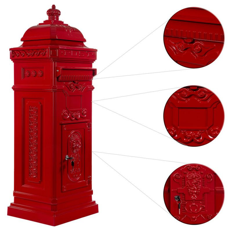 Krásná robustní poštovní schránka v antickém stylu v úžasně červené barvě. Vysoce stabilní a odolná proti povětrnostním vlivům. Chcete-li praktický a zároveň neokoukaný doplněk k vašemu domu, pak je tato schránka to pravé právě pro Vás! Vnitřní prostor schránky je 0,15 m³. Velikost otvoru pro poštu je 26 x 3 cm, takže se do otvoru vejdou i větší a tlustší obálky, zároveň krytka schránky ochrání poštu před povětrnostními podmínkami.