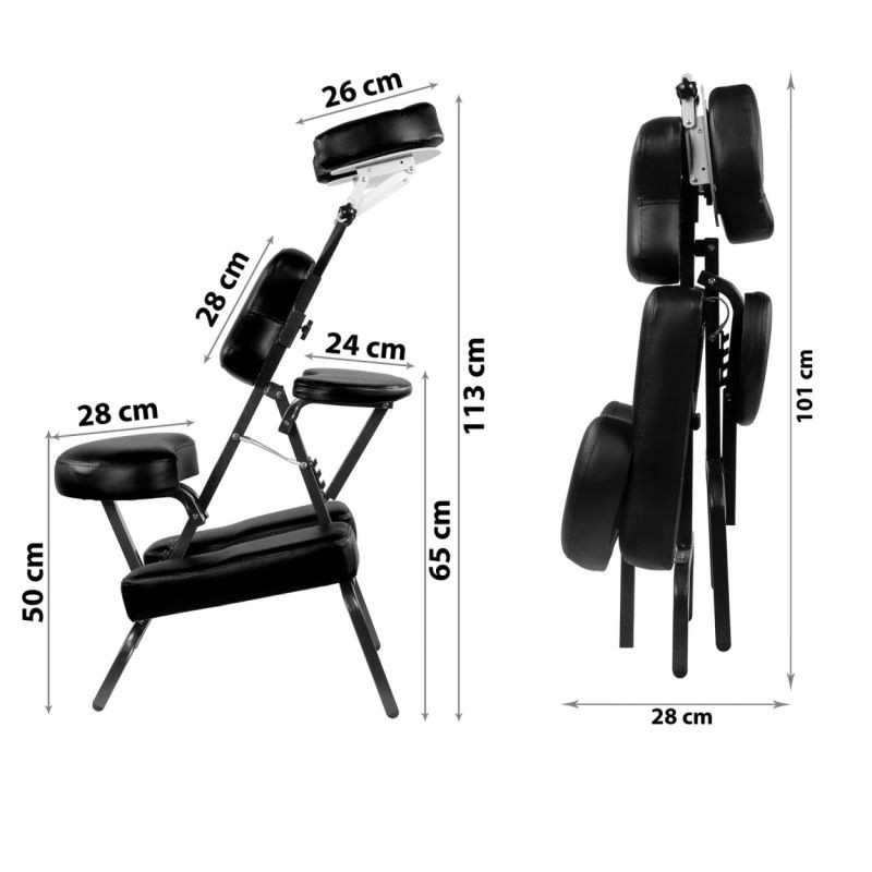Značková skládací masážní židle je určena pro maséry, rehabilitační pracovníky, fyzioterapeuty, tetovací studia apod. Sedadlo a opěrky jsou nastavitelné. Vzhledem k její nízké hmotnosti a skladnosti lze se židlí snadno manipulovat, přepravovat ji a skladovat. Zabere jen minimum prostoru. Součástí balení je i taška na přenášení lehátka.