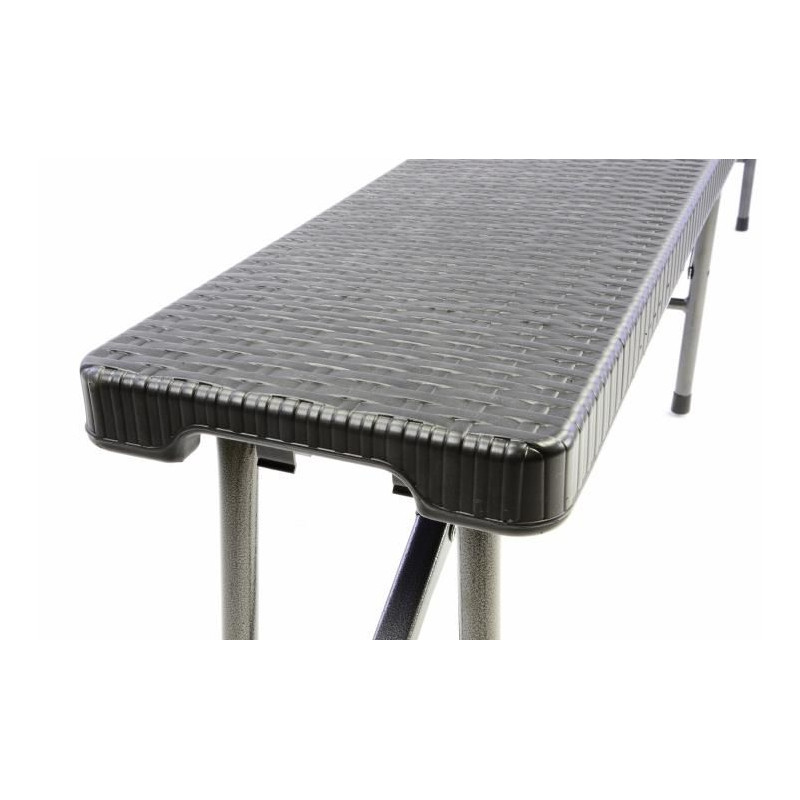 Černá sklopná lavice s elegantním designem ratanového designu upoutá Vaši pozornost. Je postavena během okamžiku, lavici si můžete sebou vzít na party, díky integrovanému úchytu můžete lavici snadno transportovat. Pro případ, že lavici momentálně nepotřebujete, můžete ji úsporně uskladnit. Materiál je nenáročný na údržbu a nechá se snadno omývat. Je vhodný jak pro vnitřní tak i venkovní prostory. Tím Vašim oslavám nestojí nic v cestě.