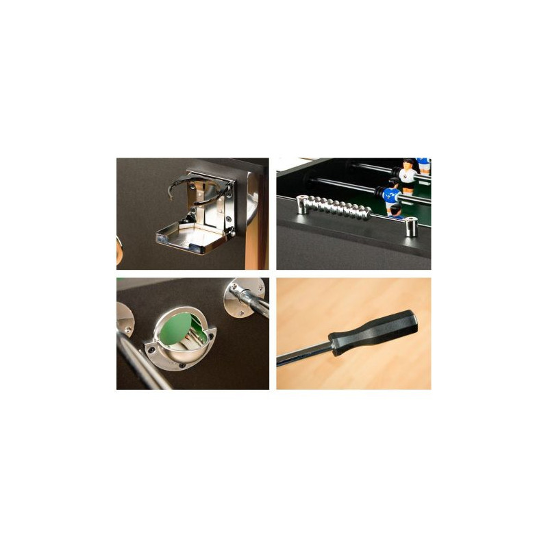 Kvalitní stolní fotbálek, který vás nadchne už srovnáním kvality a ceny.Tento fotbal má tělo vyrobeno z MDF a je vybaven čtyřmi výškově nastavitelnými ocelovými nohami (s chromovým vzhledem a gumovými nožičkami pro ochranu podlahy). Výhodou tohoto fotbálku jsou též držáky nápojů, protiskluzové rukojeti pro pohodlnější hru, malované figurky k našroubování a zkosené rohy, které zabrání uvíznutí míčku. Stůl je dodáván rozmontovaný, ale jeho montáž je velmi rychlá a snadná.